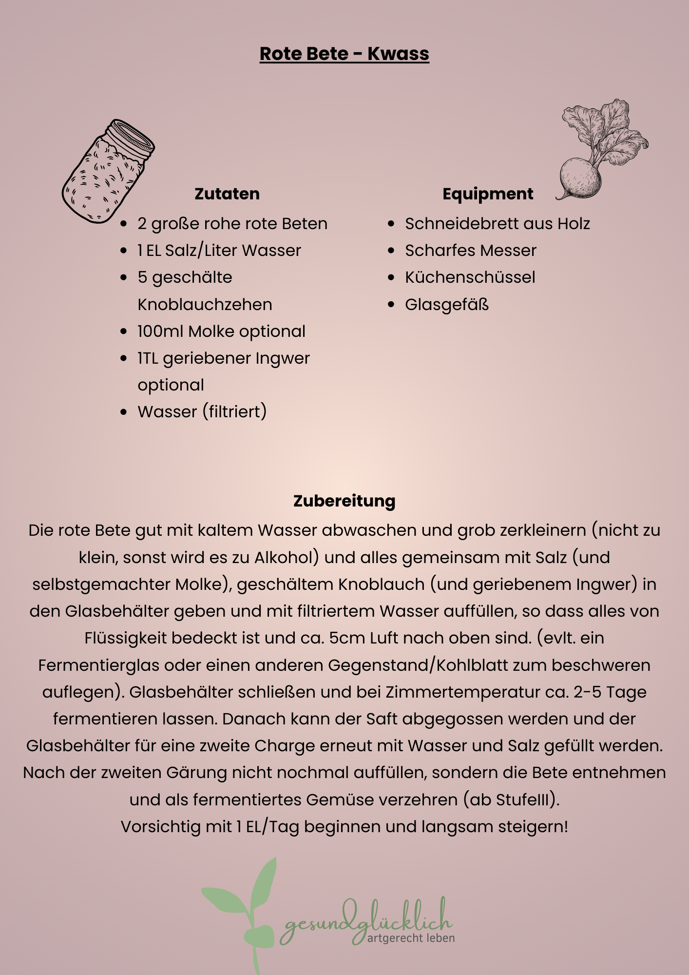 Kwass ist ein fermentiertes Getränk, das durch natürliche Milchsäuregärung entsteht. In deinem Fall nutzt du rohe Rote Bete, Wasser und etwas Salz, sowie Knoblauch und optional Ingwerscheiben.